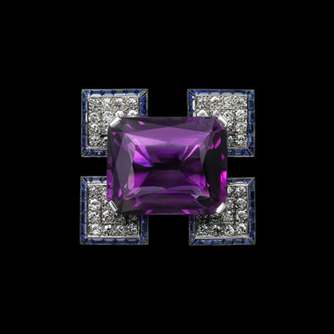 Im Jahr 1925, als die Ausstellung "Exposition Internationale des Arts Decoratifs et Industriels Modernes" in Paris eröffnete, wurde die Stilrichtung des Art Déco geboren. Schmuck wirde kühn, übergroß und einzigartig - so wie diese dekorative Cartierbrosche mit intensiv violettem Riesenamethyst.