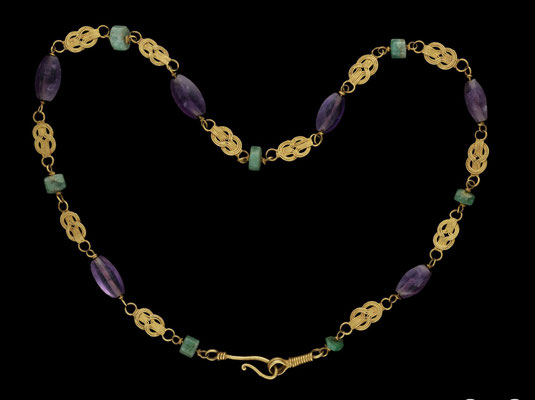 Im Bild ein hellenistisches Collier aus Amethytsten und Smaragden aus dem 1. Jhd nach Chr.