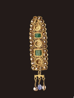 Oft finden sich auch goldene, mit Perlen verzierte Haarnadeln, zierliche Diademe oder goldene Haarnetze.