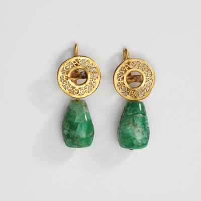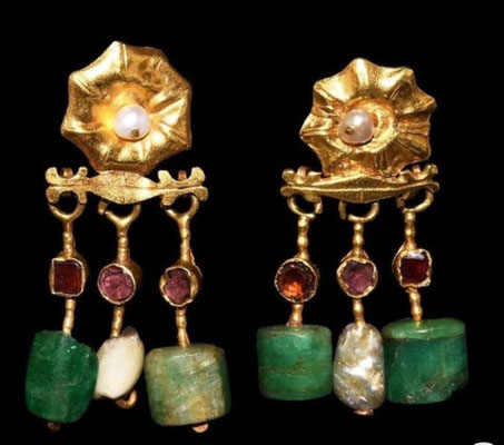 Beim Ohrschmuck gibt es drei Grundformen: im 1. Jhdt finden sich runde oder tropfenförmige Anhänger. Später wechselte der Geschmack zu S-förmig gebogenen Haken aus Golddraht, auf denen bis zu fünf Perlen aus verschiedenen Materialien und in verschiedenen Farben aufgezogen waren. Die dritte Form sind aufwendigere Gehänge, bei denen an einer waagerechten Haste meist zwei oder drei, manchmal sogar vier senkrechte Stäbchen hängen, die zumeist am unteren Ende mit einer weißen Perle verziert sind.