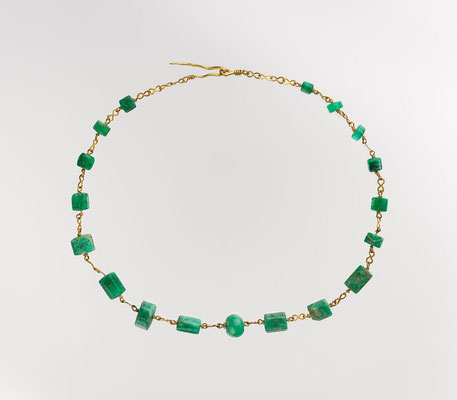 Meist wurden die Steine zu zylindrischen oder runden Perlen geschliffen. Manchmal finden sich prächtige Colliers, die die Edelsteine in Gold gefasst zeigen.